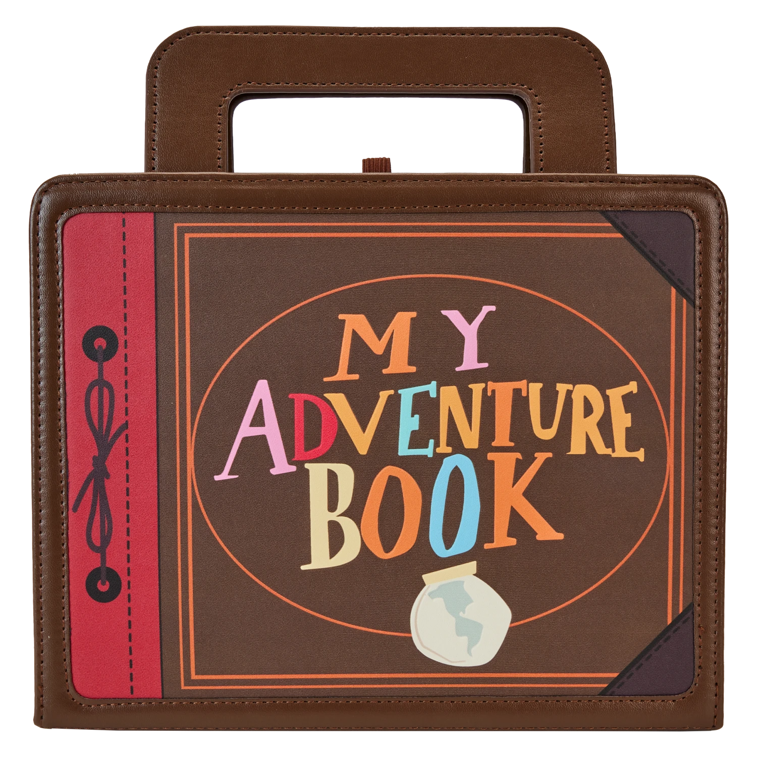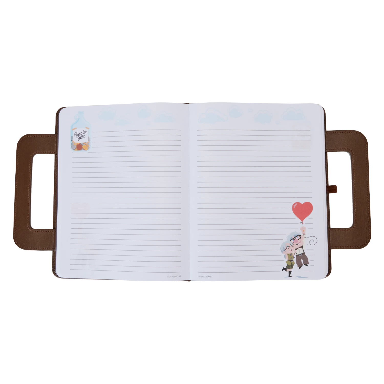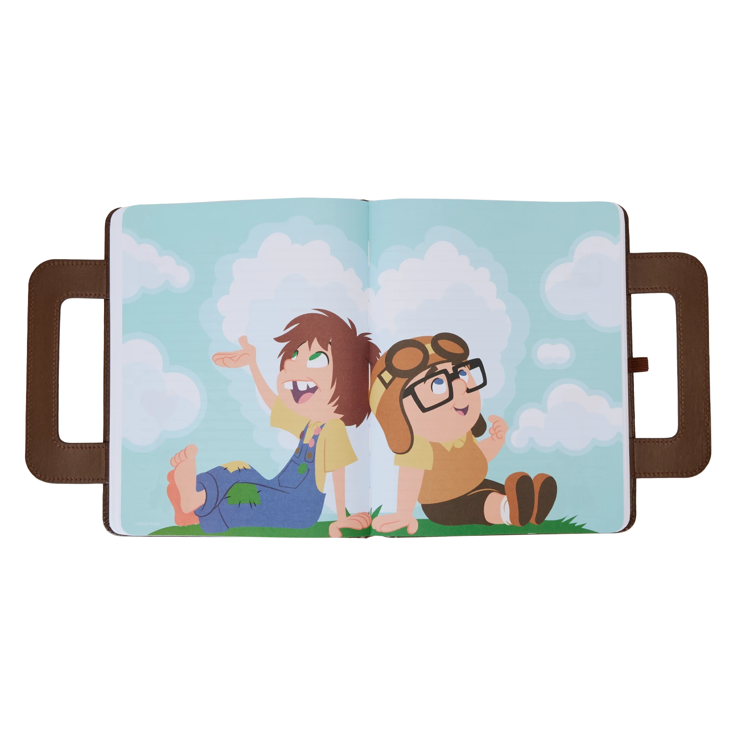 The Loungefly Pixar Up 15th Anniversary Adventure Book Lunchbox Journal is made of vegan leather (polyurethane). Additional features include sticky note and printed details.