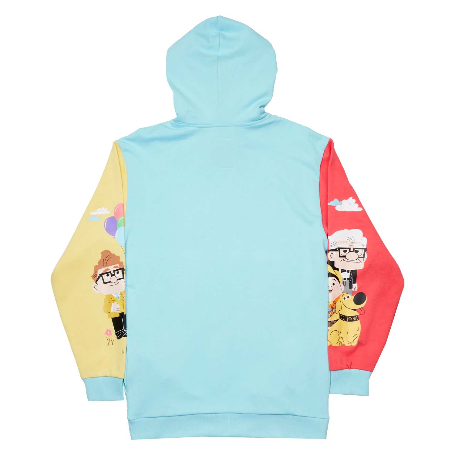 Up, up, and away! Let your adventures take flight with the Loungefly Pixar Up 15th Anniversary Unisex Hoodie. On the front, Carl and Ellie’s house floats through the sky with the help of colorful balloons. Pockets appear on each side of the sweatshirt, giving you space to store your belongings. On one sleeve, a young Carl and Ellie drift on a bouquet of balloons. On the other, Carl stands with Russel and Dug. Extra-large drawcords cinch together the hood, which features an all-over printed lining of clouds and balloons. This comfortable hoodie makes a heartwarming addition to any outfit and will keep you looking stylish on all your travels.