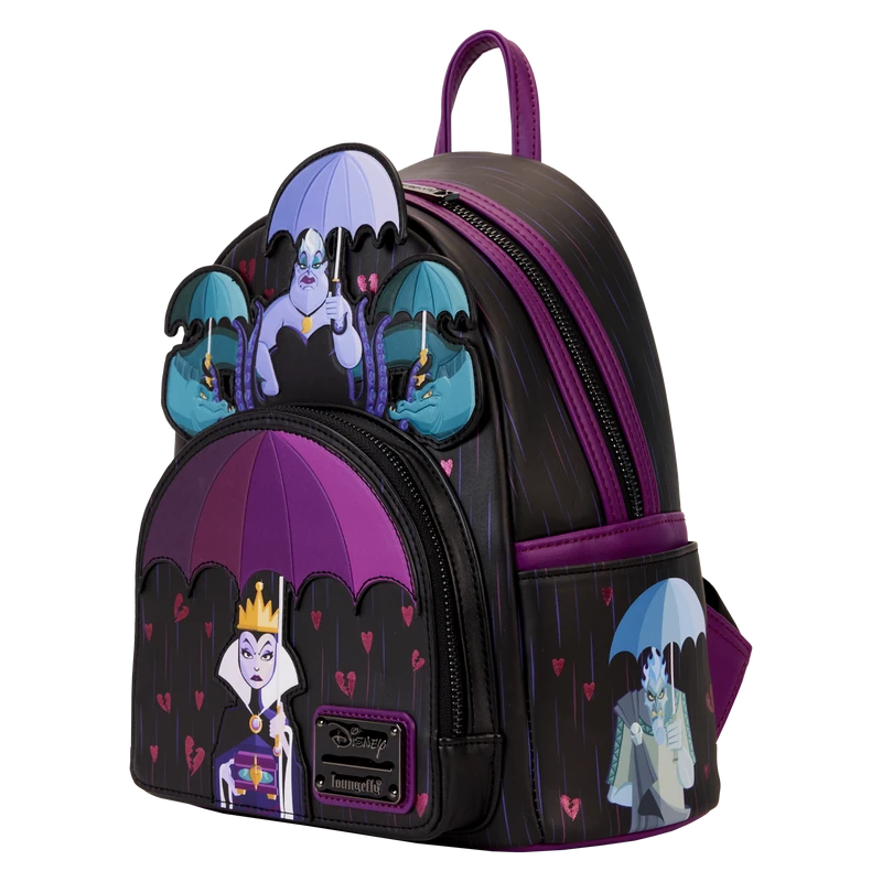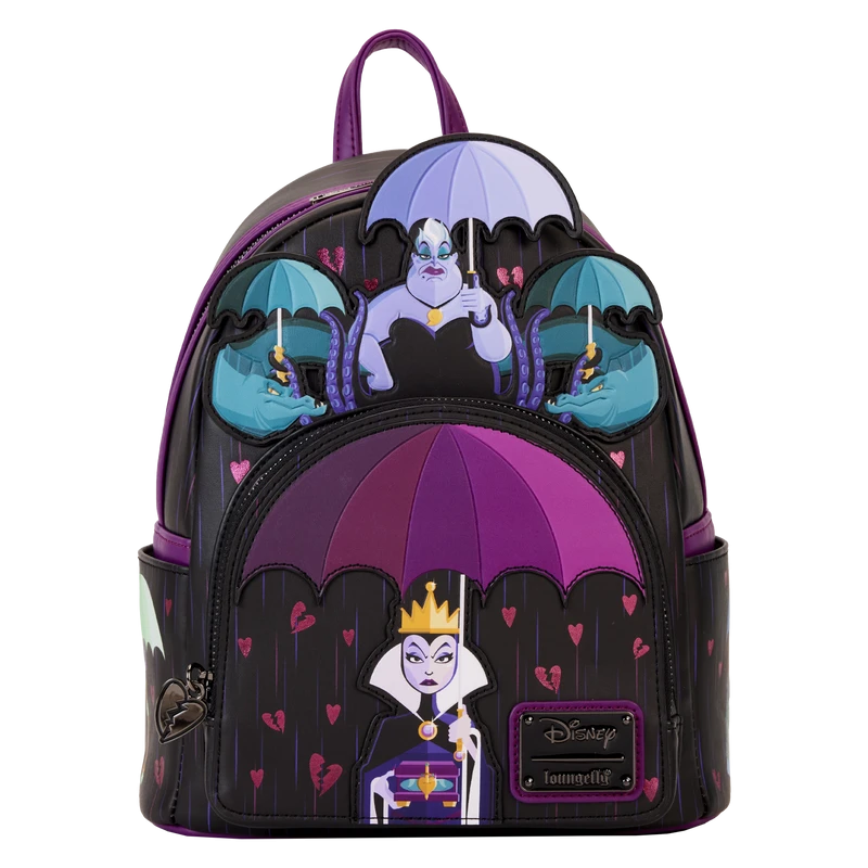 Hearts will ache when you pass by with this Villains Curse Your Hearts Mini Backpack. On the front, above the pocket, a die-cut applique of Ursula appears, and she looks quite disgruntled. Her purple umbrella rises up over the top as magnificent appliques of Flotsam and Jetsam hold their own umbrellas against torrential rain and a foil print of broken hearts. The dome of the front pocket takes on a purple umbrella shape, under which Evil Queen appears, unamused. She’s holding her heart box, and a broken-heart zipper charm tops off the look. Original printed artwork of more Villains with umbrellas appears on the side pockets, including Maleficent and Hades—both shielding themselves from the rain. The unrelenting storm continues on the back, where Jafar holds his own umbrella, with the words “Curse Your Hearts” forming in stylized letters above. Take off on journeys of whatever your dark heart desires with this wonderfully wicked accessory.