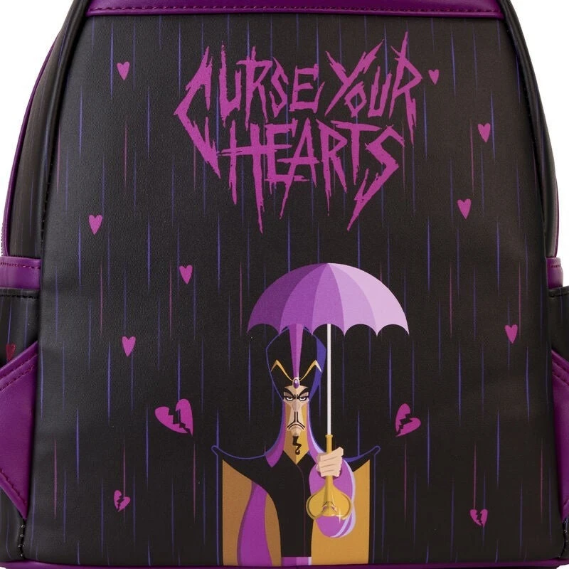 The Villains Curse Your Hearts Mini Backpack is made of vegan leather (polyurethane). Bag has adjustable shoulder straps, side pockets, a gunmetal-colored molded zipper charm, and gunmetal-colored hardware. Additional features include applique, debossed, foil, and printed details. Take note of the coordinating inside lining.
