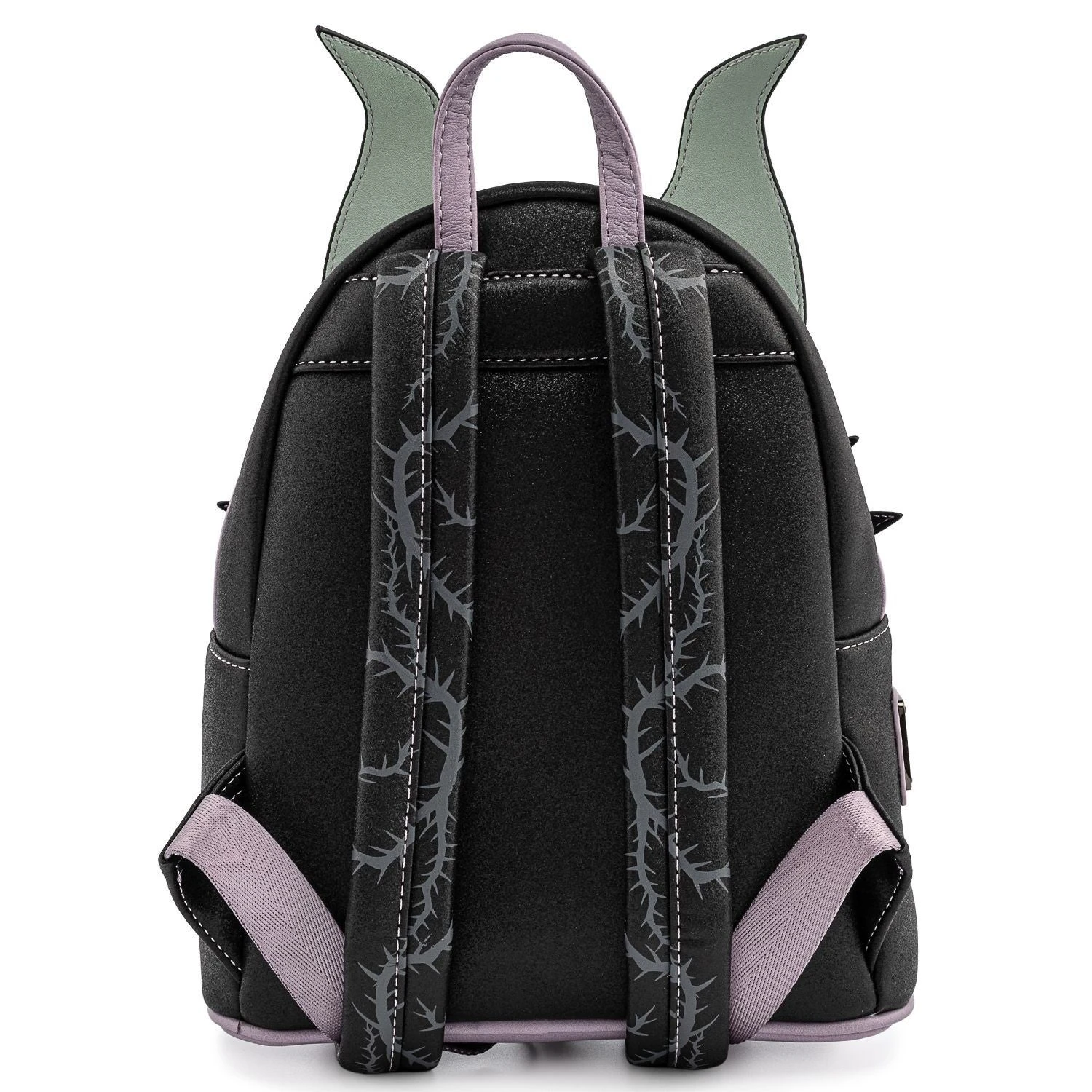 The Sleeping Beauty Maleficent Scenes Cosplay Mini Backpack is made of vegan leather (polyurethane). The bag has adjustable shoulder straps, sturdy metal hardware, and features: applique, embroidered, debossed, and printed details. Take note of the coordinating pattern of the inside lining fabric.