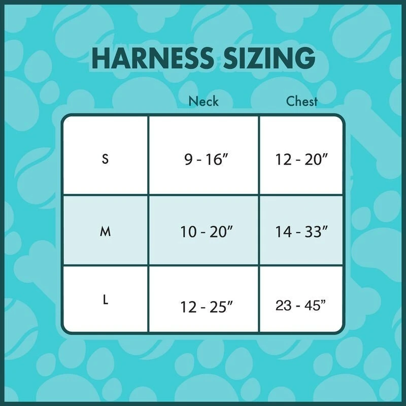 Harness dimensions: (Small) Neck: 9”-16” X Chest: 12”-20”; (Medium) Neck: 10”-20” X Chest: 14”-33”; (Large) Neck: 13”-25” X Chest: 23”-45”